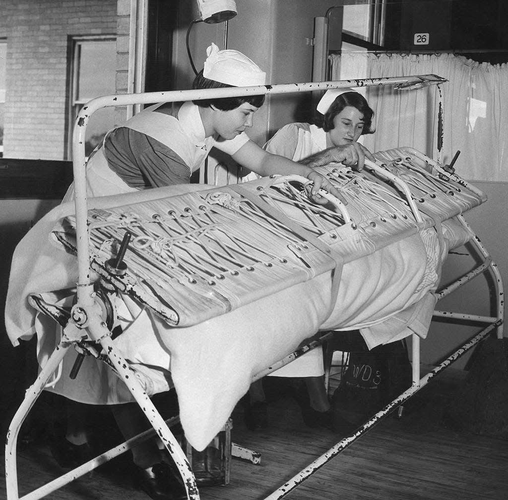 extended from bedhead to footboard, not in the usual position of flat side down but all standing on their long edge. Two orderlies lifted on top of them. Here I spent two and a half months being turned every two hours from right side to stomach and back again.