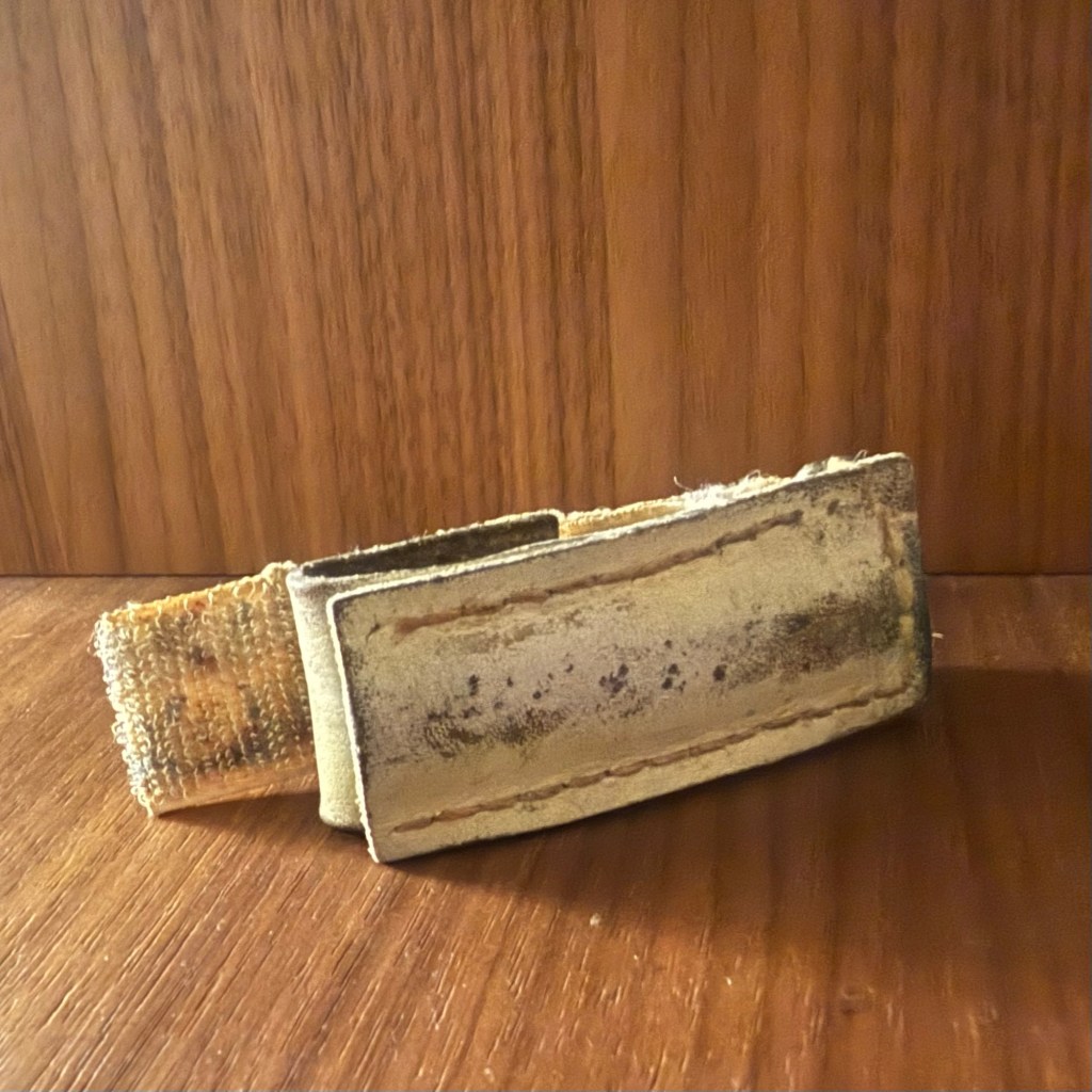 strips of leather that she machine-sewed one on top of the other around three edges, and a piece of strong elastic that connected the leather at one end to create a band. The open end formed a sheath into which implements